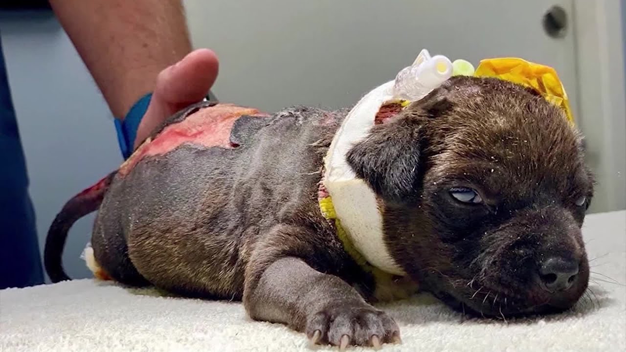 Eliie Roberto, som arbeider i organisasjonen Animal Hope uttaler til KCBS-TV: «Hun er så liten, dette er tortur for en to uker gammel valp».