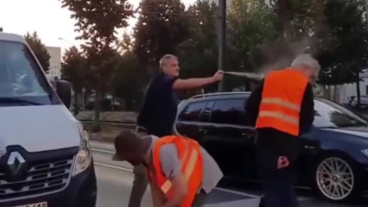 Videoen viser en gruppe klimaaktivister som har satt seg midt på en travel vei. De blokkerer all trafikk, og flere bilister står fast. En av dem, en mann i mørke klær, prøver først å få dem til å flytte seg med ord. Når han ikke når frem, henter han noe i bilen.