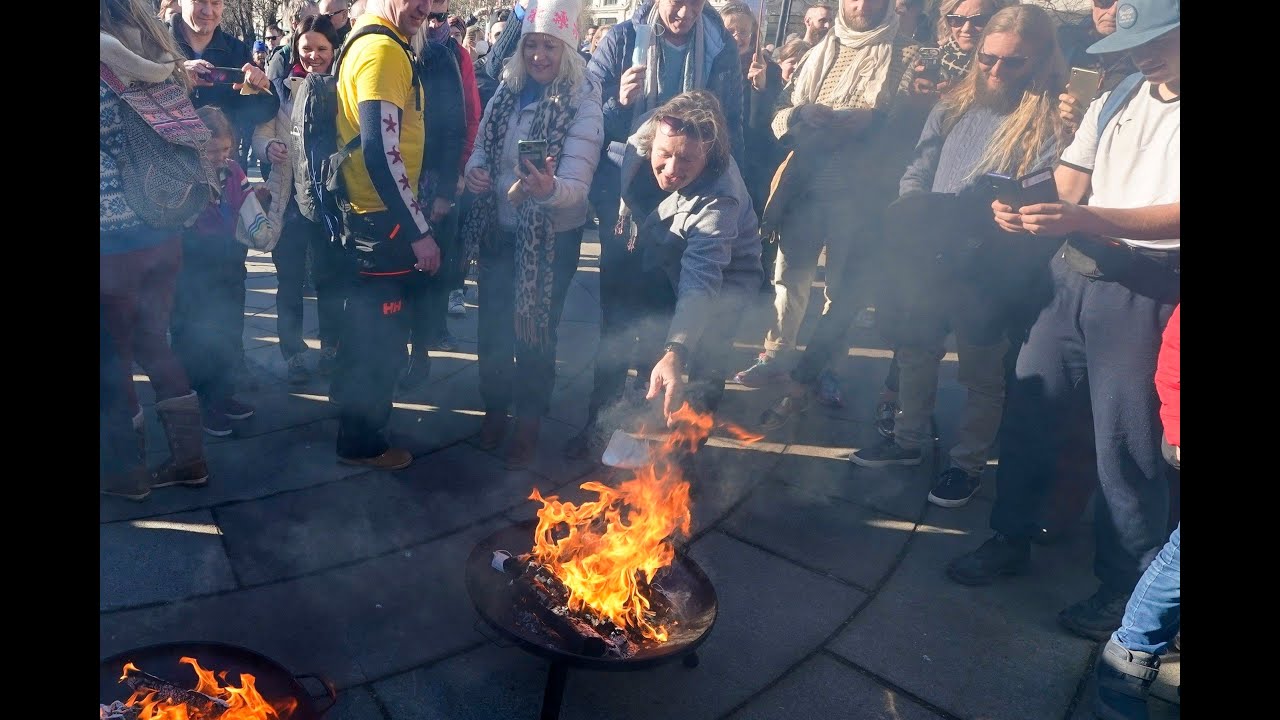 Nedenfor kan du se videoen hvor Svein setter fyr på munnbindet etter den første demonstrasjonen han deltok i.