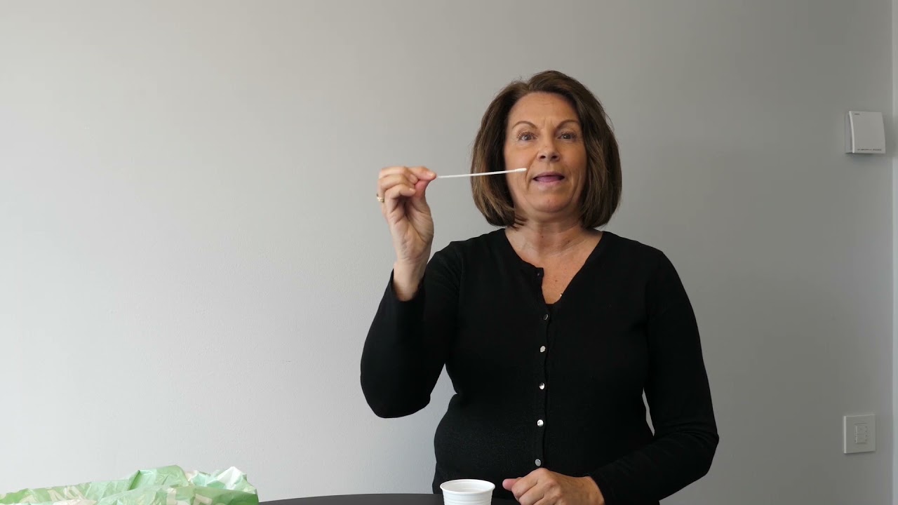 - Plasser bomullspinnen to til fire centimeter opp i et av neseborene (ikke like langt inn som ved PCR-test som gjøres av helsepersonell), gni den mot slimhinnen og roter pinnen tre til fire ganger. Gjenta i det andre neseboret.
